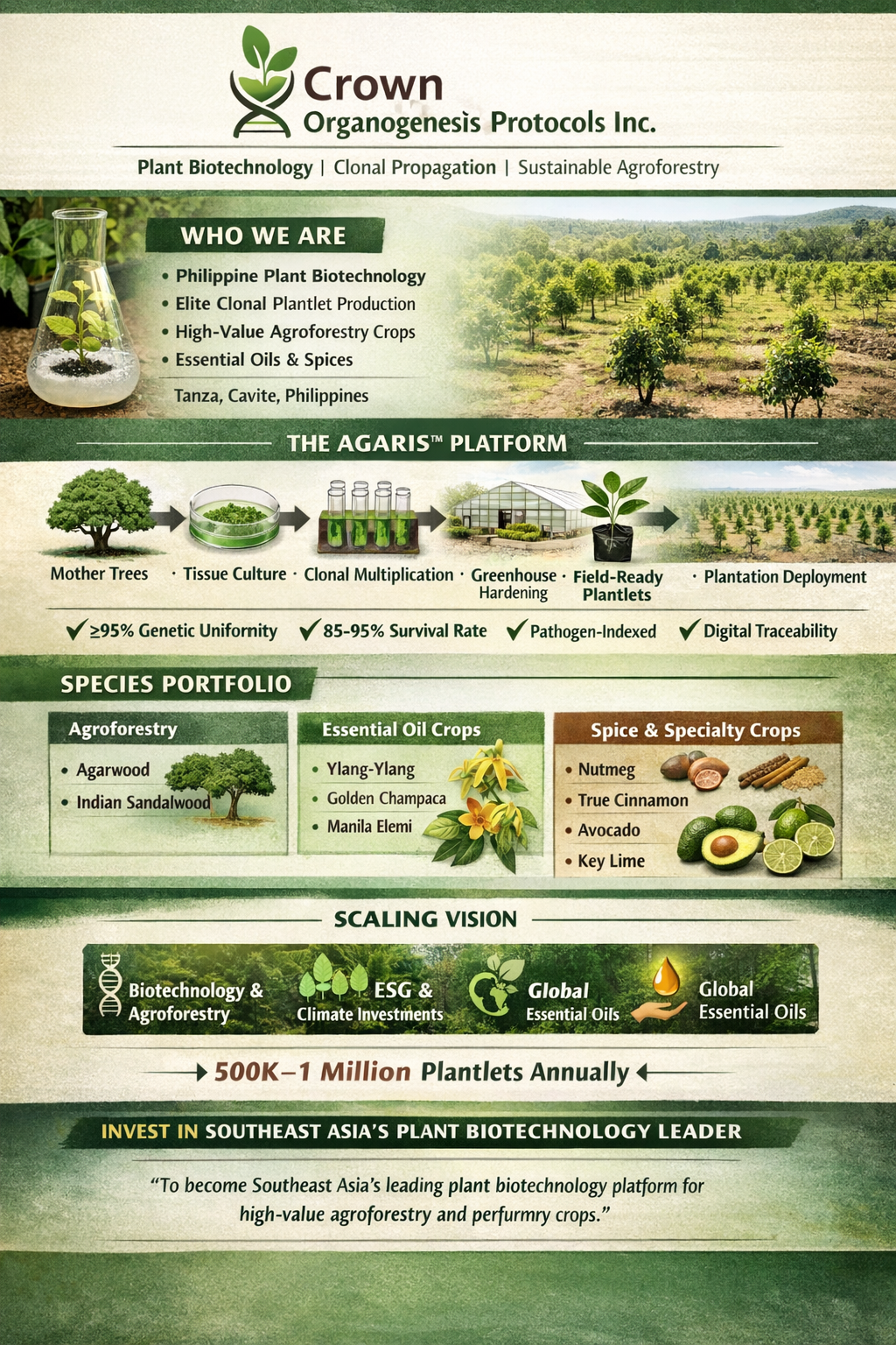 Tanza, Cavite, Philippines — Crown Organogenesis Protocols Inc. (COPI), a Philippine-based plant biotechnology company, today announced its call for strategic investors to accelerate the national and international expansion of its proprietary Agaris™ Plant Biotechnology Platform, a Lab-to-Land™ clonal propagation system for high-value agroforestry and perfumery crops.